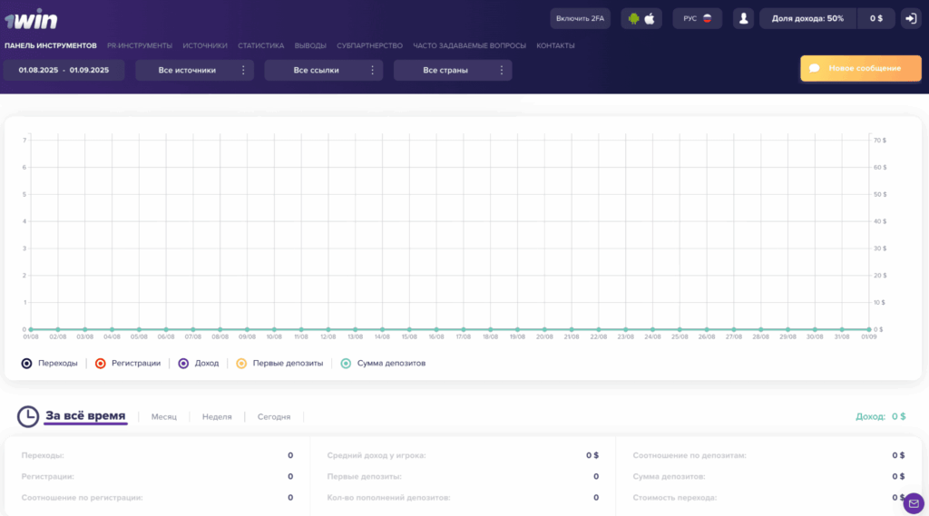 Панель инструментов в личном кабинете партнера 1win Partners