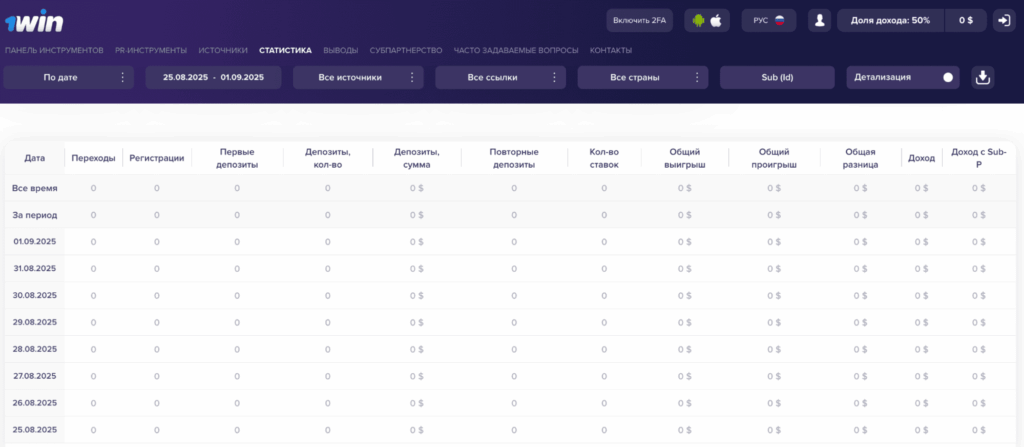 Подробная статистика в личном кабинете партнера 1win Partners