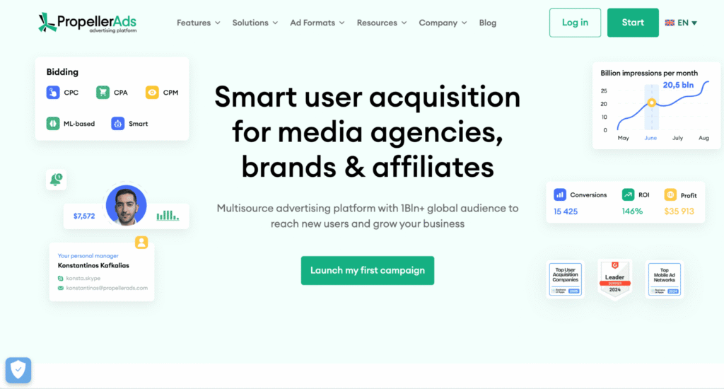 PropellerAds — мощная экосистема, которая работает на рынке с 2011 года. В 2026 году сеть остается эталоном в вопросах обхода систем блокировки рекламы и качества антифрод-фильтров.