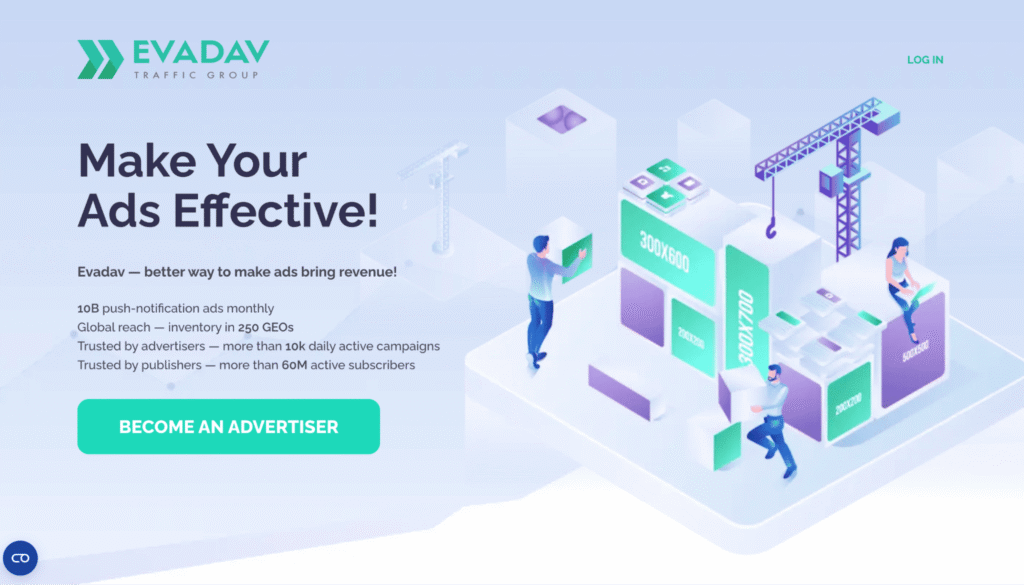 - 4+ млрд визитов в месяц, 120 000+ активных паблишеров и 10 000+ запущенных кампаний;