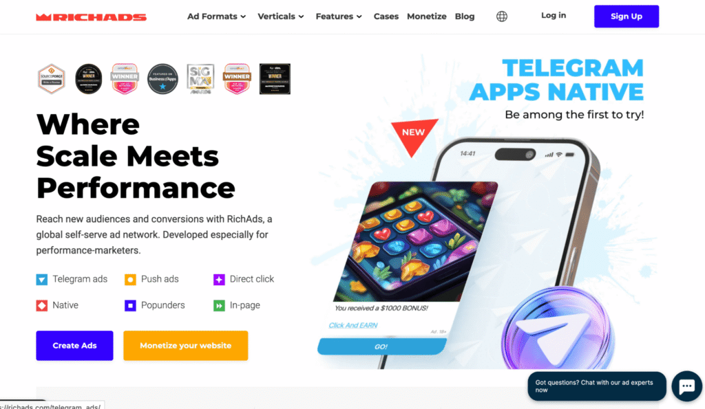 - Доступные форматы рекламы включают пуш-уведомления, попандер, in-page и нативную рекламу. Платформа развивает отдельные направления Search и Mobile для работы с разными типами трафика;