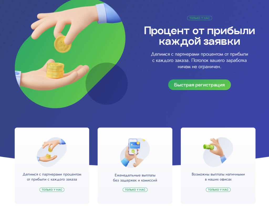 Выплаты: зависят от услуги, региона и модели оплаты. От нескольких сотен рублей по CPL до 10% от заказа.