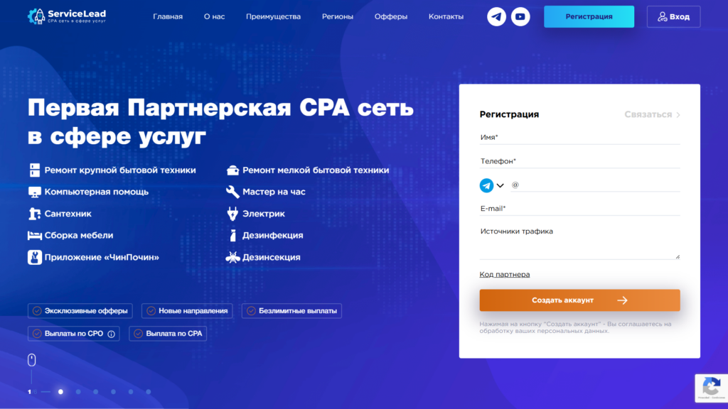 Найти офферы по ремонту и бытовым услугам можно в нескольких CPA-сетях и у прямых рекламодателей. В последние годы появились специализированные партнерки, заточенные под эту вертикаль. Их преимущество — узкий фокус: они работают с сетями сервисных центров, колл-центрами, закрывают заказы, а арбитражникам предлагают готовые инструменты для привлечения лидов.