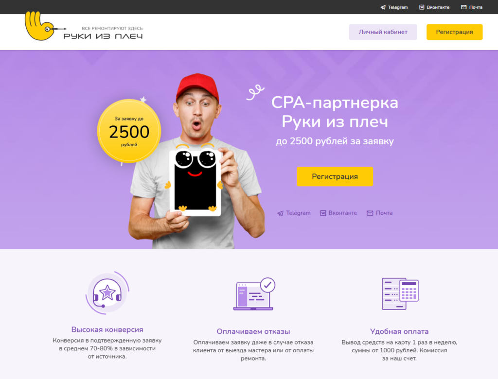 Партнерка «Руки из плеч» — собственная CPA-сеть одноименной сети сервисных центров, покупающая заявки по ремонту бытовой техники и электроники, сантехнике и электрике, уборке, ремонту квартир.