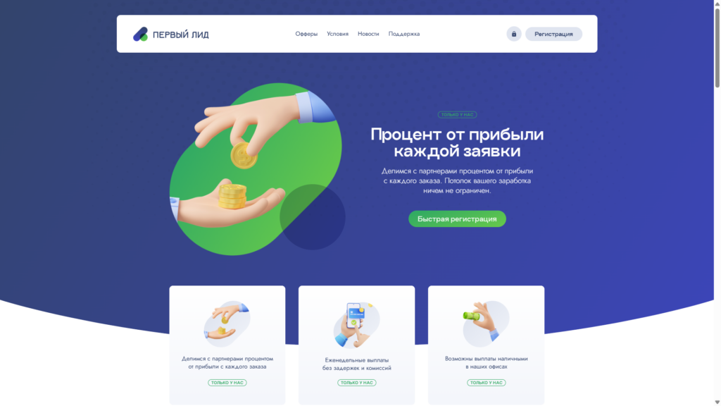 Особенности: собственный колл-центр обзванивает заявки. Холд — до 24 часов. Разрешены любые источники трафика.