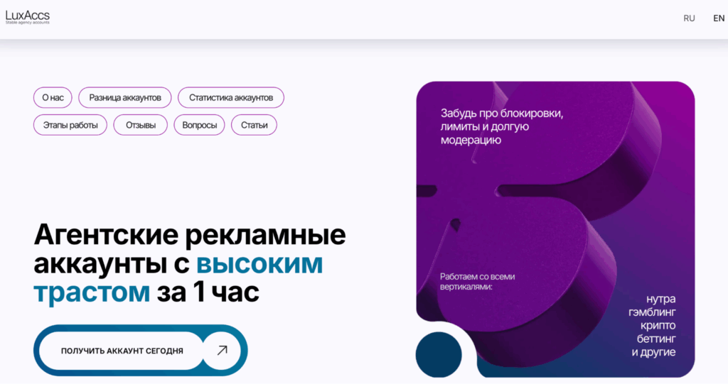 LuxAccs — это сервис, ориентированный на арбитражников, которым нужен стабильный доступ к агентским рекламным аккаунтам с высоким трастом. Они предлагают аккаунты для платформ — Facebook / Meta, Google Ads, Taboola, Bing и других.