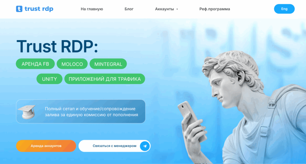 Стартовая страница сервиса по аренде агентских аккаунтов Trust RDP