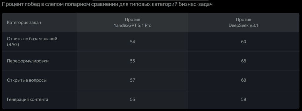 По данным русскоязычных бенчмарков, которые приводит Яндекс, модель хорошо работает с фактами, культурным контекстом и образовательными вопросами. А вот со сложной математикой и программированием уступает китайскому конкуренту.