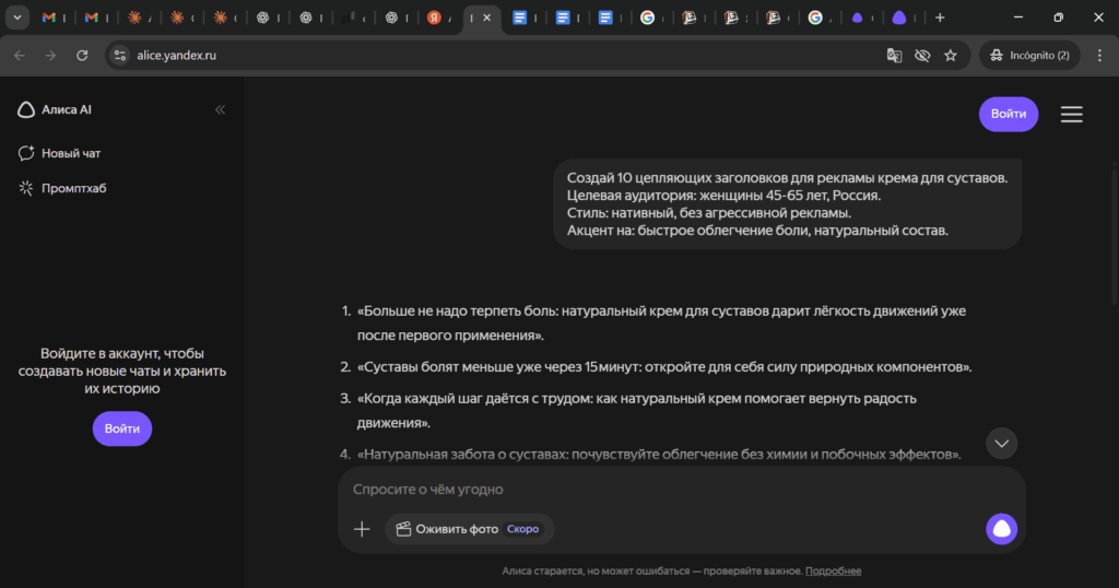 Следите за фильтрами при подключении API. Cейчас модель генерирует контент для казино, беттинга, нутры. Но Яндекс может ужесточить политику в любой момент. Не полагайся на Alice AI как на единственный источник креативов для серых вертикалей.