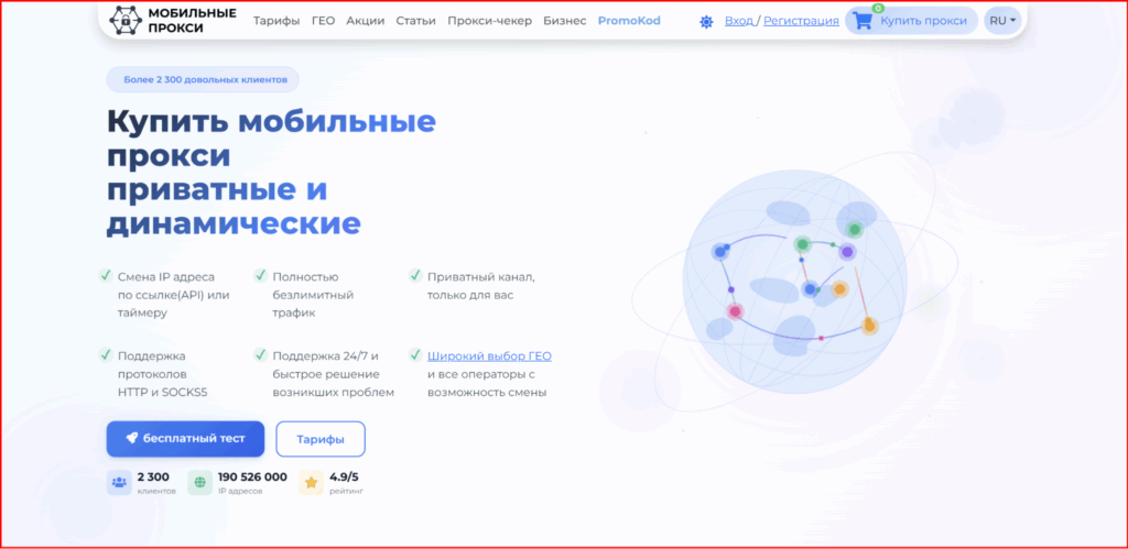 Сервис мобильных прокси, предоставляющий доступ к реальным мобильным IP-адресам от операторов связи более чем из 40 стран и около 185 городов. Прокси выдаются в индивидуальное пользование, что исключает совместное использование и обеспечивает высокую анонимность и стабильность работы. Сервис поддерживает протоколы HTTP(S) и SOCKS5, предлагает неограниченный трафик и гибкие тарифы с минимальным сроком аренды от одного дня.