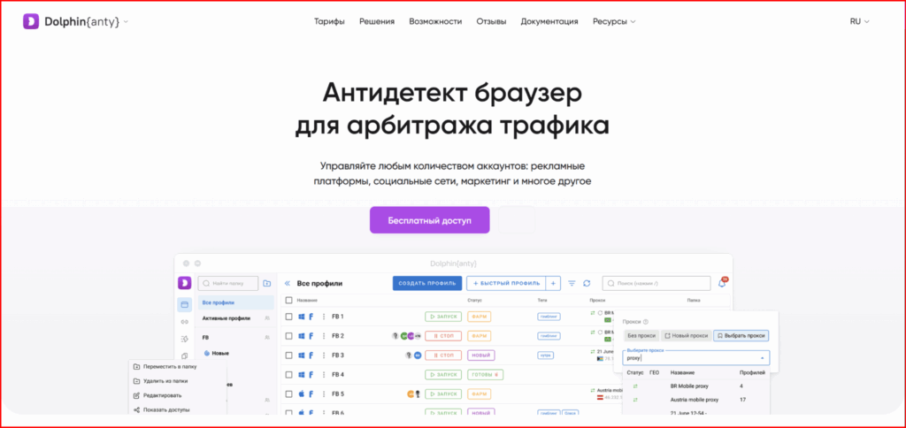Антидетект-браузер, предназначенный для безопасного мультиаккаунтинга, управления большим числом онлайн-профилей и обхода антифрод-систем при работе с трафиком, криптовалютой и e-commerce. Подменяет цифровые отпечатки браузера (Canvas, WebGL, WebRTC и др.), создает уникальные профили с изолированными cookie и кэшем, а также поддерживает массовое управление аккаунтами через автоматизацию и интеграции с API.