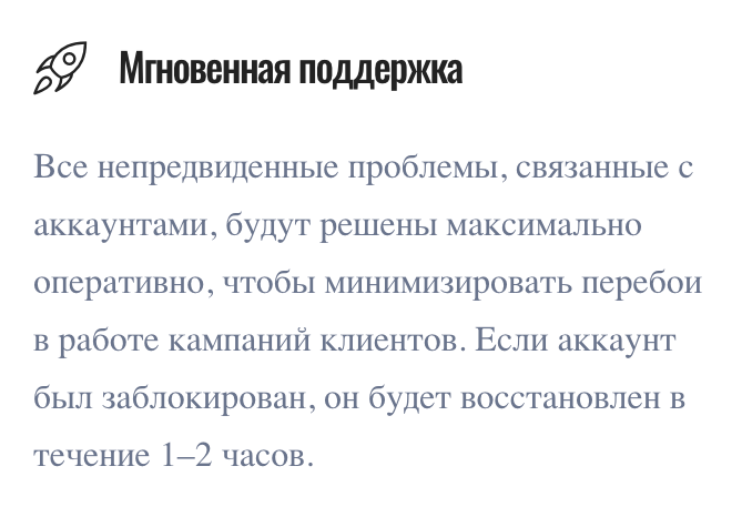 | В случае блокировки аккаунты заменяют бесплатно и бытро — от 1 до 60 минут. Это ключевой фактор для медиабаеров, которые не могут позволить себе простои и потерю бюджета во время активных запусков. |
