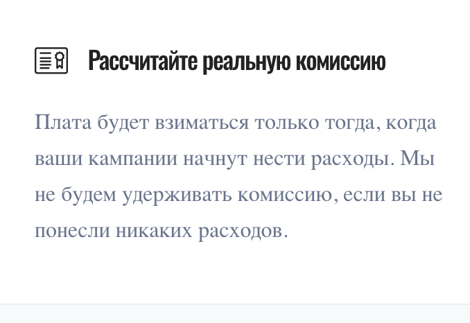 Комиссия. Стандартная комиссия варьируется от 4% до 8% и зависит от объемов и формата сотрудничества. Для клиентов, которые работают с агентством на долгой дистанции и показывают стабильный спенд, комиссия может быть снижена.