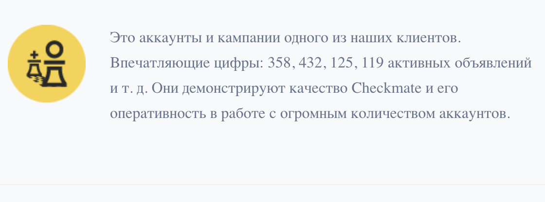 | Checkmate самостоятельно подготавливает фан-страницы, профили и пиксели. Клиент получает готовую инфраструктуру и может сразу запускать кампанию, не отвлекаясь на дополнительную подготовку. | |