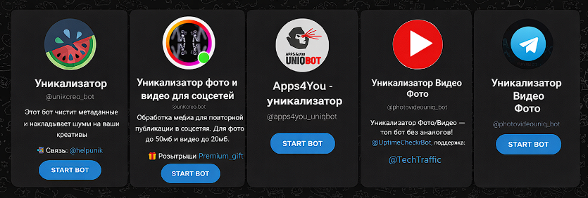 При выборе уникализатора полезно отталкиваться от формата трафика и объемов работы. Если вы делаете по несколько уников в день и часто меняете крео прямо с телефона, удобнее использовать телеграм‑ботов: отправил файл, получил готовый результат и сразу закинул его в рекламный кабинет.