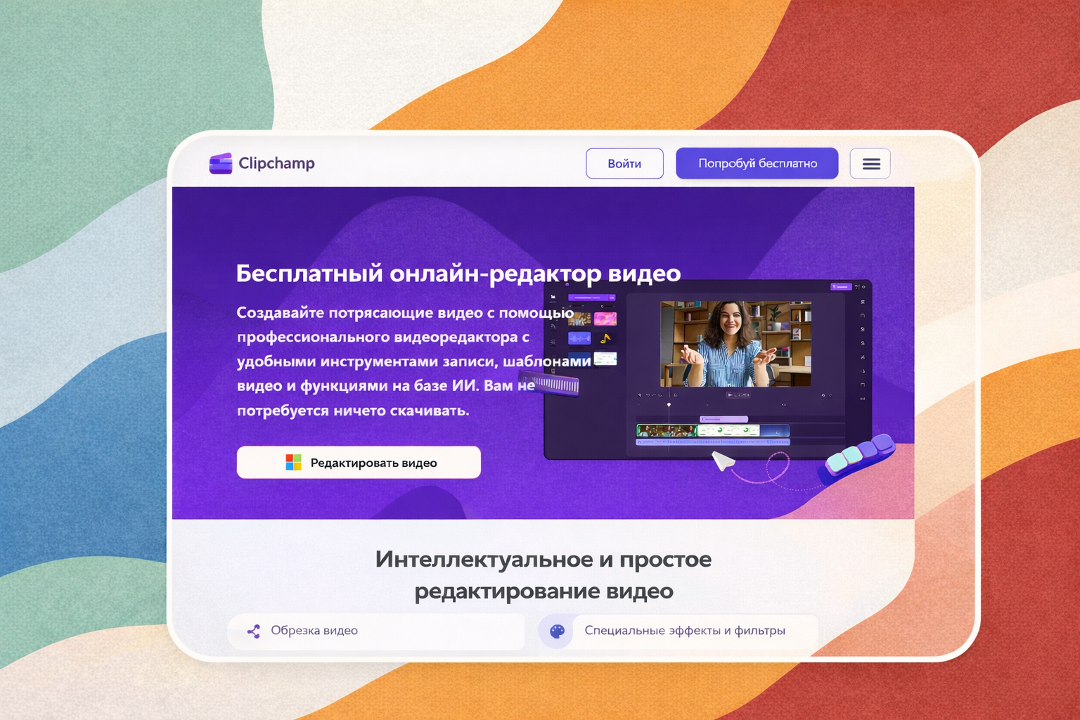 Формат и оплата: онлайн‑видеоредактор от Microsoft, доступный как веб‑сервис и как приложение для Windows; есть бесплатный тариф с ограничением по качеству экспорта и платные подписки с расширенной функциональностью.