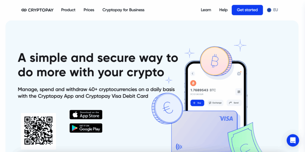 CryptoPay — европейская криптовалютная платформа, которая позволяет хранить, получать, продавать, покупать, а также обменивать криптовалюту на фиатные деньги. Платформа выпускает виртуальные и пластиковые карты, которые работают с платежной системой VISA.