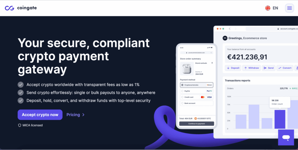 CoinGate — криптоплатежная платформа, позволяющая принимать валюту как бизнесам, так и физлицам. Функции сервиса позволяют автоматически конвертировать крипту в фиат или стейблкоины. Сервис частично некастодиальный: некоторые функции обязывают хранить средства на платформе.