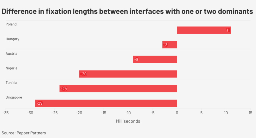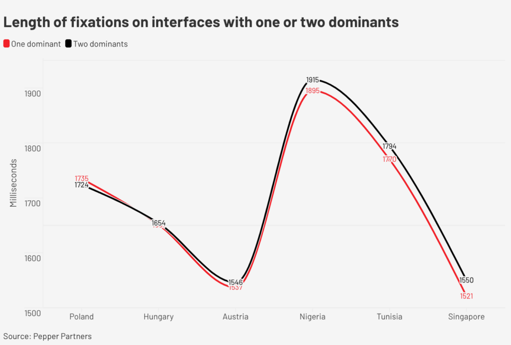 - У Нигерии саккады в среднем на 13% короче, чем у Сингапура. У пользователей из Туниса быстрые и короткие переключения выражены на 11% короче. При этом фиксации на доминантах у Нигерии и Туниса на 17% длиннее, чем у Сингапура, и на 16% больше, чем у Австрии.