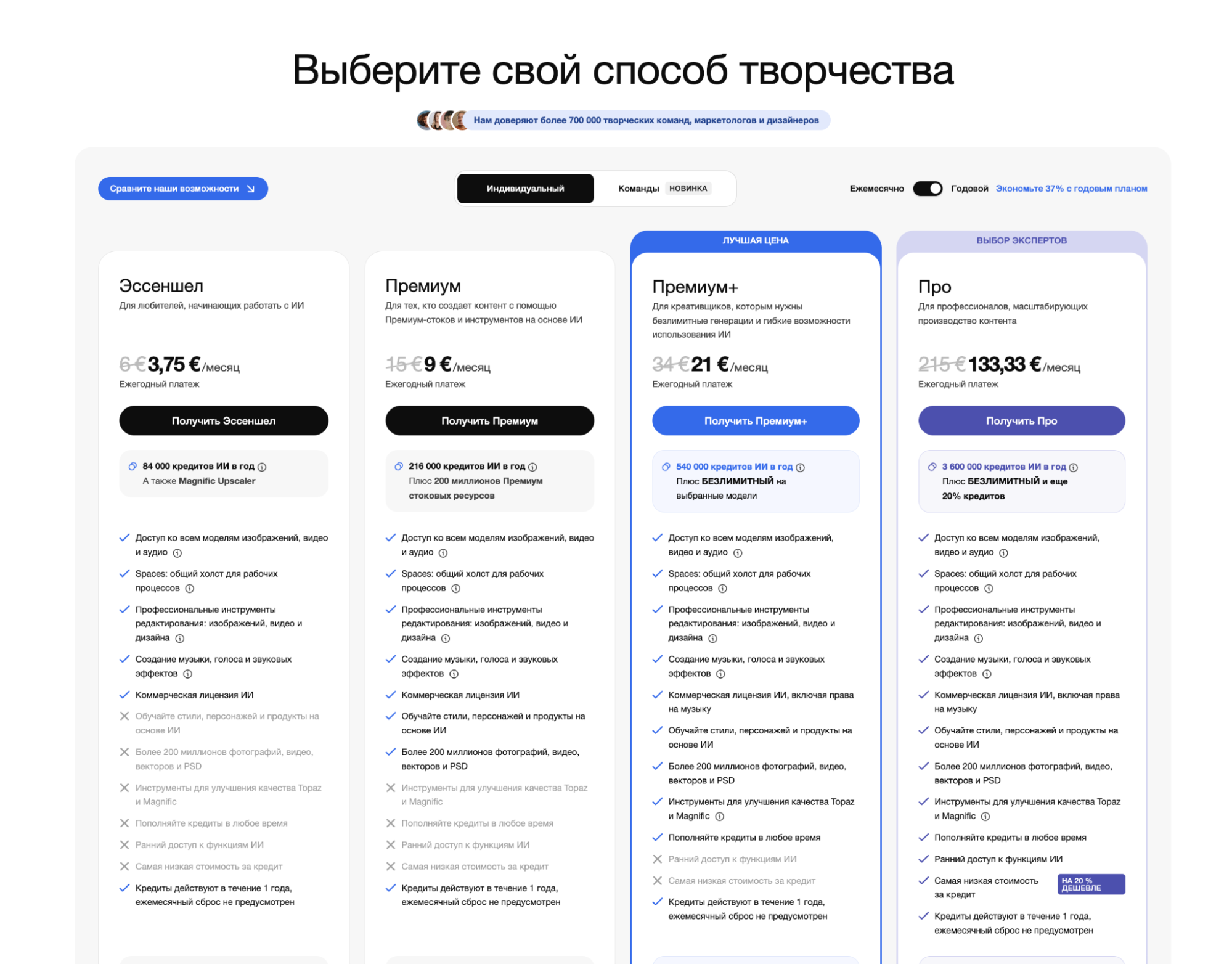 - Freepik Premium+ — €34 / месяц (45 000 ИИ-кредитов, а также безлимит на выбранные модели);