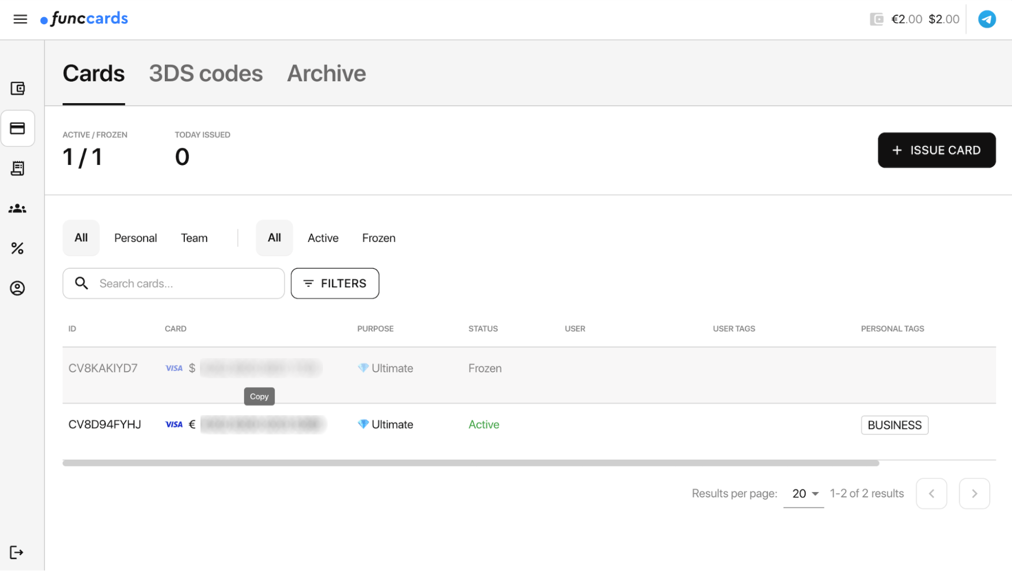 Центральный раздел личного кабинета — «Cards». В верхней части сразу видны показатели по картам, а ниже — список со всеми основными полями: ID, тип карты, назначение, статус, пользователь и теги. Также здесь выпускаются новые карты — через кнопку «Issue card».