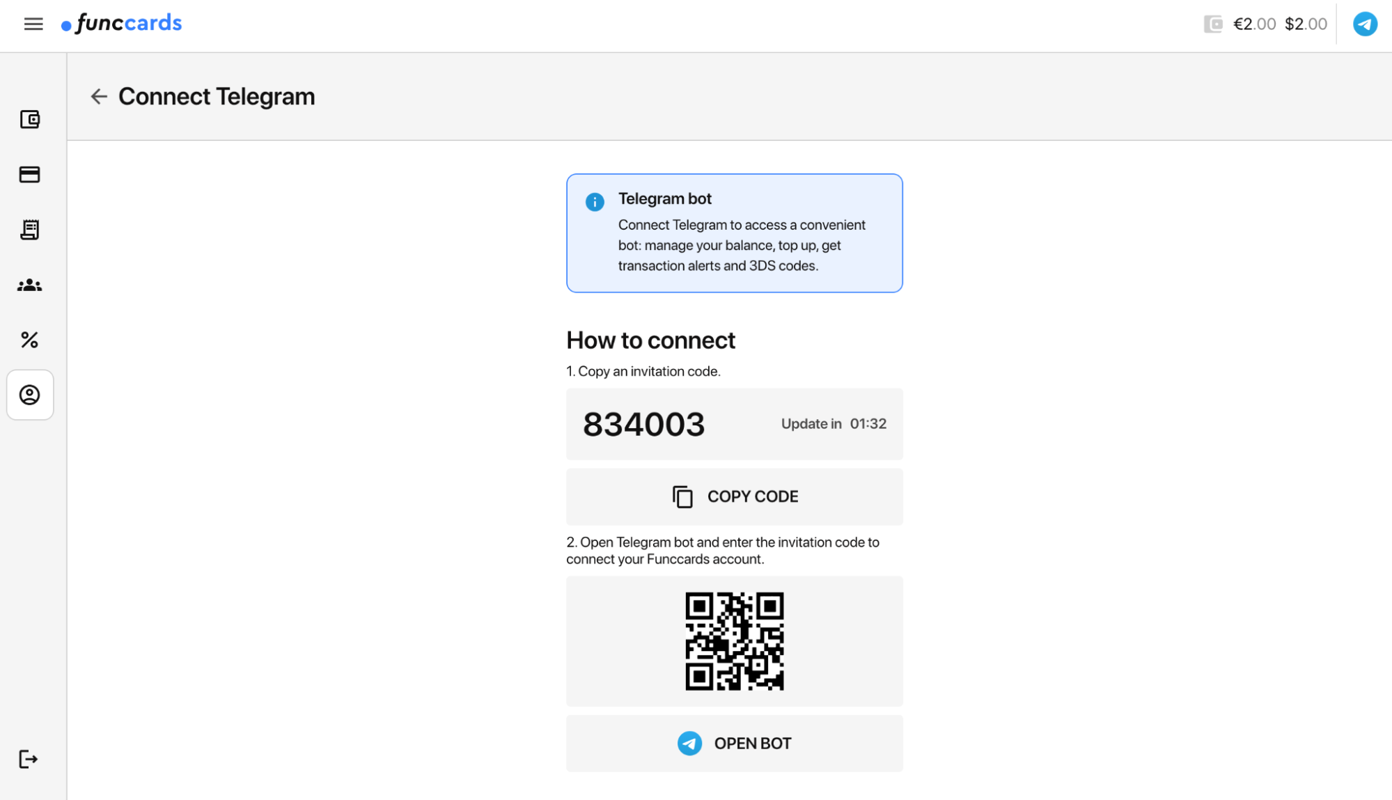 Коды дополнительно дублируются в боте @FuncCardsBot — его можно установить сразу после регистрации. Кроме того, бот позволяет отслеживать транзакции и пополнять баланс — удобно, если у вас в моменте нет доступа к личному кабинету.