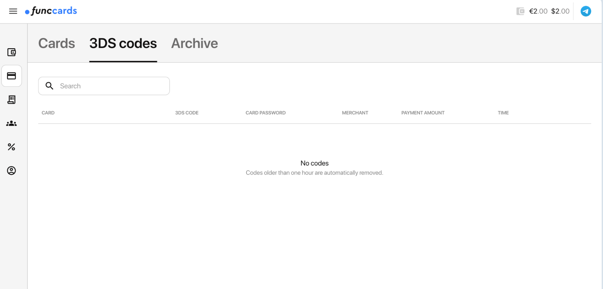 Отдельной вкладкой вынесены «3DS codes». Коды подтверждения не нужно искать в переписках или ждать на почту — они собраны в одном месте и доступны ровно тогда, когда требуются для оплаты.