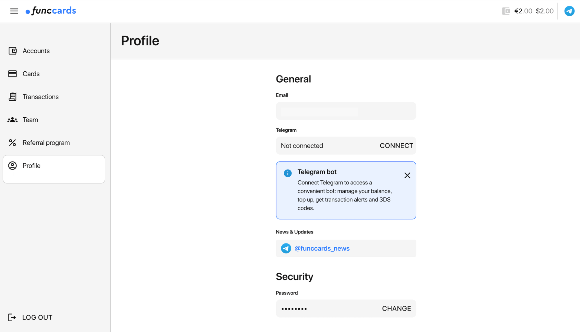 В разделе «Профиль» можно связать аккаунт Телеграмм с личным кабинетом FuncCards