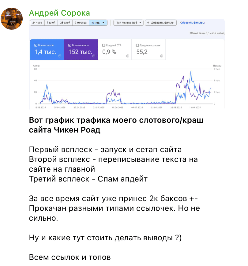Есть кейсы, когда сайты выросли. Например, опытный вебмастер Андрей Сорока делится, что после осеннего спам-апдейта один из его сайтов вернул позиции.