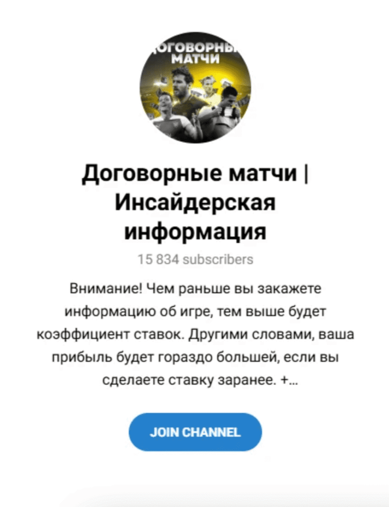 Более 95% инсайдов в телеграмм-каналах — это обычные догадки и продвижение канала с продажей подписки, замаскированной под доступ к закрытой информации об исходе матчей.