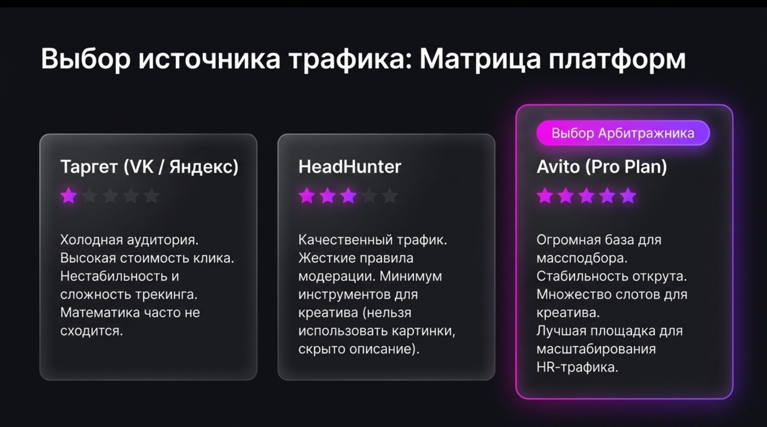Кирилл начинал с HeadHunter, но быстро столкнулся с жесткой модерацией и отсутствием гибких инструментов. Перейдя на Авито, он обнаружил, что эта площадка в разы эффективнее для массподбора (курьеры, сборщики, водители), так как здесь аудитория более «теплая» и массовая.