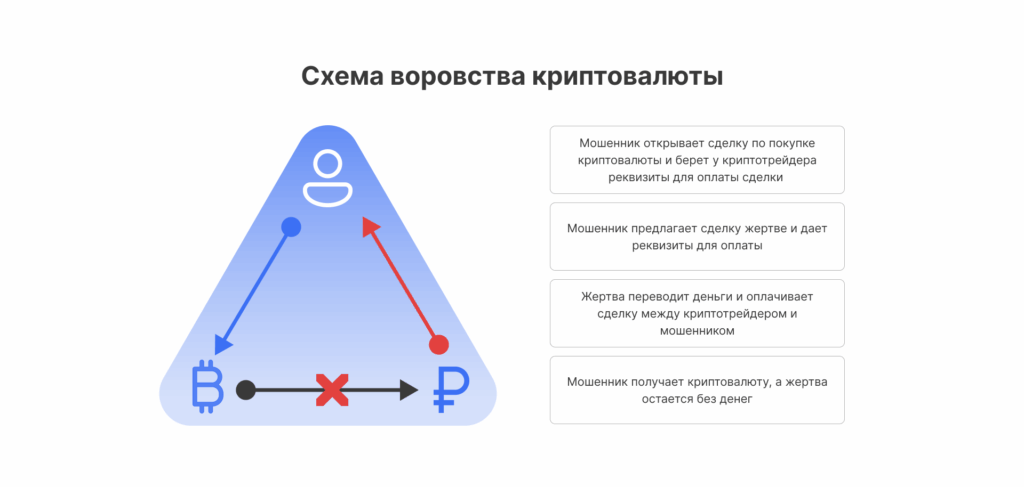 Главный риск при выводе крипты — блокировка счета и запрос банком обоснования источника происхождения средств. Со стороны ФНС, при отсутствии документов на обмен, налог на криптовалюту могут начислить на полную сумму зачислений. Отдельно стоит отметить риски прямого мошенничества с подменой реквизитов, «треугольные» схемы с третьими лицами, фальшивые уведомления о платеже, клоны сайтов и боты без юридических данных.