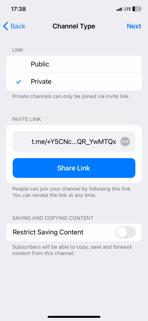 Выберите тип канала — публичный или приватный. Если публичный, то нужно будет указать публичную ссылку. Если приватный — ссылка сгенерируется автоматически.