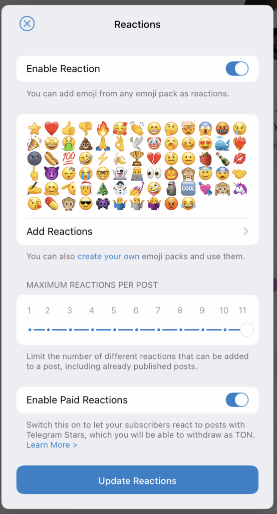 Настройки позволяют выбрать, какие реакции открыть. Можно оставить только позитивные (например, сердечки) и отключить нежелательные.