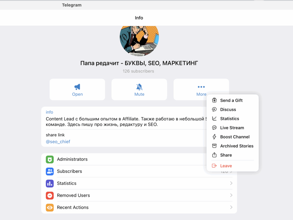 - Поделиться ссылкой на канал (если он публичный).