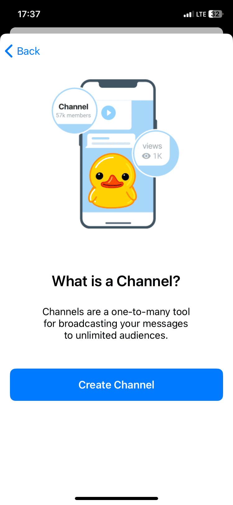 Далее появляется выбор из создания группы, контакта или канала. При нажатии на «Создание канала» открывается красивое окно с Уточкой.