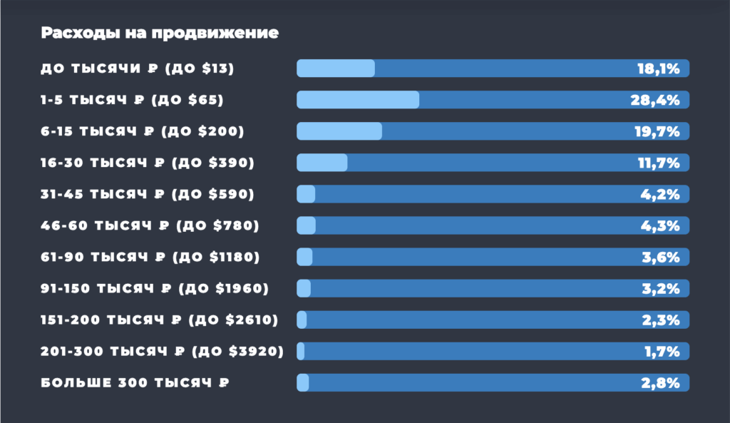 По статистике TgStat за 2023 год, почти половина авторов тратят на развитие сообществ до 5000 рублей в месяц или вообще обходятся без вложений. Но для серьезного старта в нишах с дорогим подписчиком расходы могут доходить до сотен тысяч рублей.