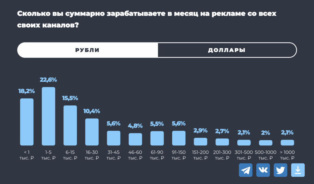 Конкретной универсальной статистики по доходам в Телеграм нет. Заработок может начинаться от символических 1000 рублей в неделю до миллионов в месяц — все определяется нишей, размером инвестиций и стратегией развития канала.