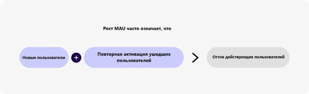 | Высокий MAU + Низкий DAU | Много пользователей заходят редко, вовлеченность низкая | Улучшать контент, добавлять пуш-уведомления, геймификацию |