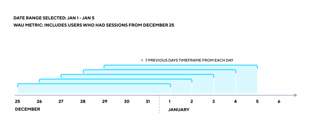 WAU (Weekly Active Users) — количество уникальных пользователей, которые взаимодействовали с продуктом хотя бы один раз за любые семь последовательных дней. Метрика сглаживает колебания внутри недели и дает честную картину там, где нагрузка распределена неравномерно. Например, в корпоративном мессенджере будни активнее выходных, и именно этот показатель отображает точную оценку уровня недельной активности. WAU не равен сумме DAU. Каждый пользователь учитывается однократно в пределах недели, даже если заходил в приложение несколько раз.