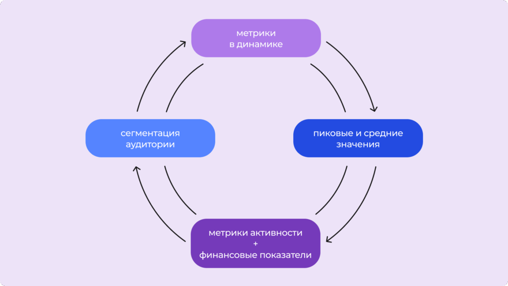 | Средний MAU + Средний DAU | Стабильная ситуация без всплесков | Внедрять новые функции, тестировать гипотезы |