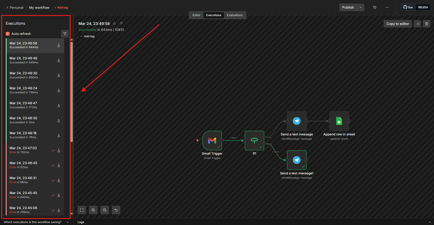 Когда все заработало — нажмите кнопку Active в правом верхнем углу. Workflow начнет работать автоматически. Историю всех срабатываний можно отслеживать в разделе Executions — там видно, какие письма были обработаны, какие прошли фильтр, а какие нет.