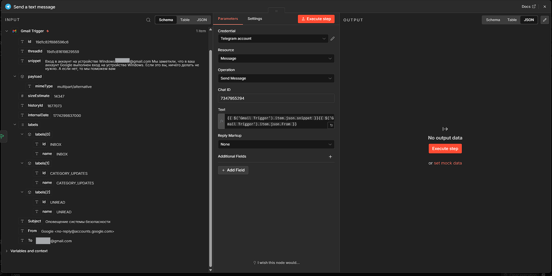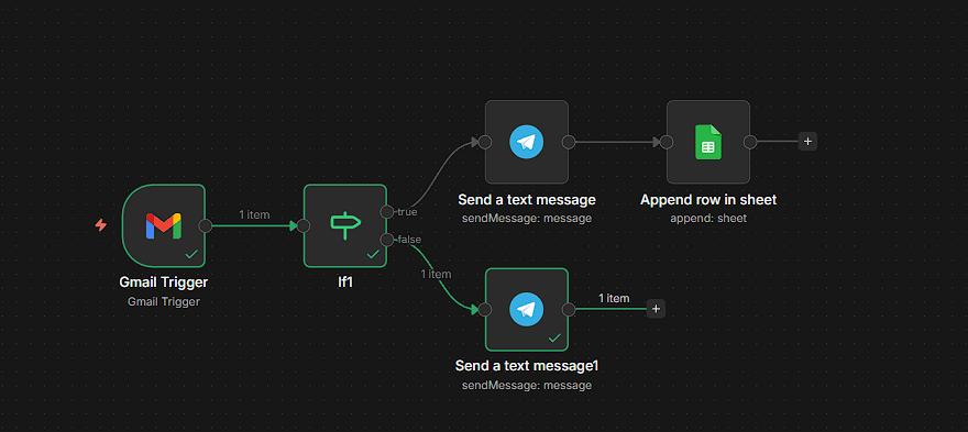Соберем конкретный рабочий сценарий. Задача: получать новые письма из Gmail, отфильтровать по ключевому слову, отправить уведомление в Telegram и сохранить данные в Google Sheets.