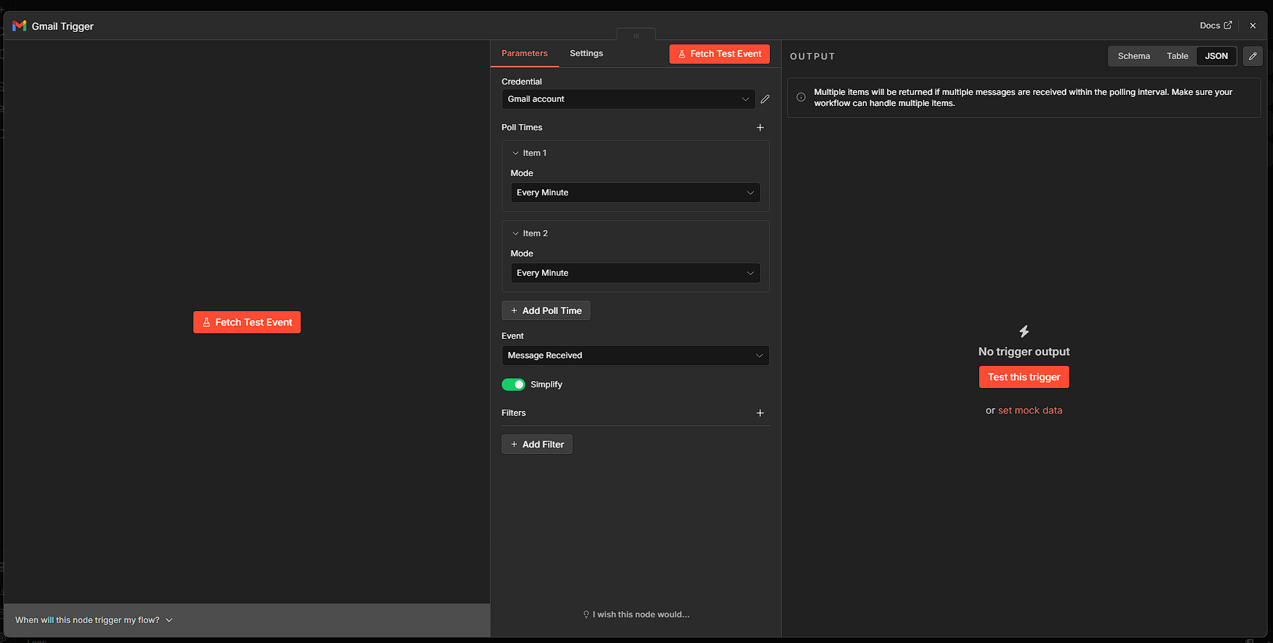 В настройках триггера выберите событие Message Received и режим опроса (Poll). n8n будет проверять почту каждые несколько минут. Если нужна мгновенная реакция — можно настроить webhook, но это сложнее.