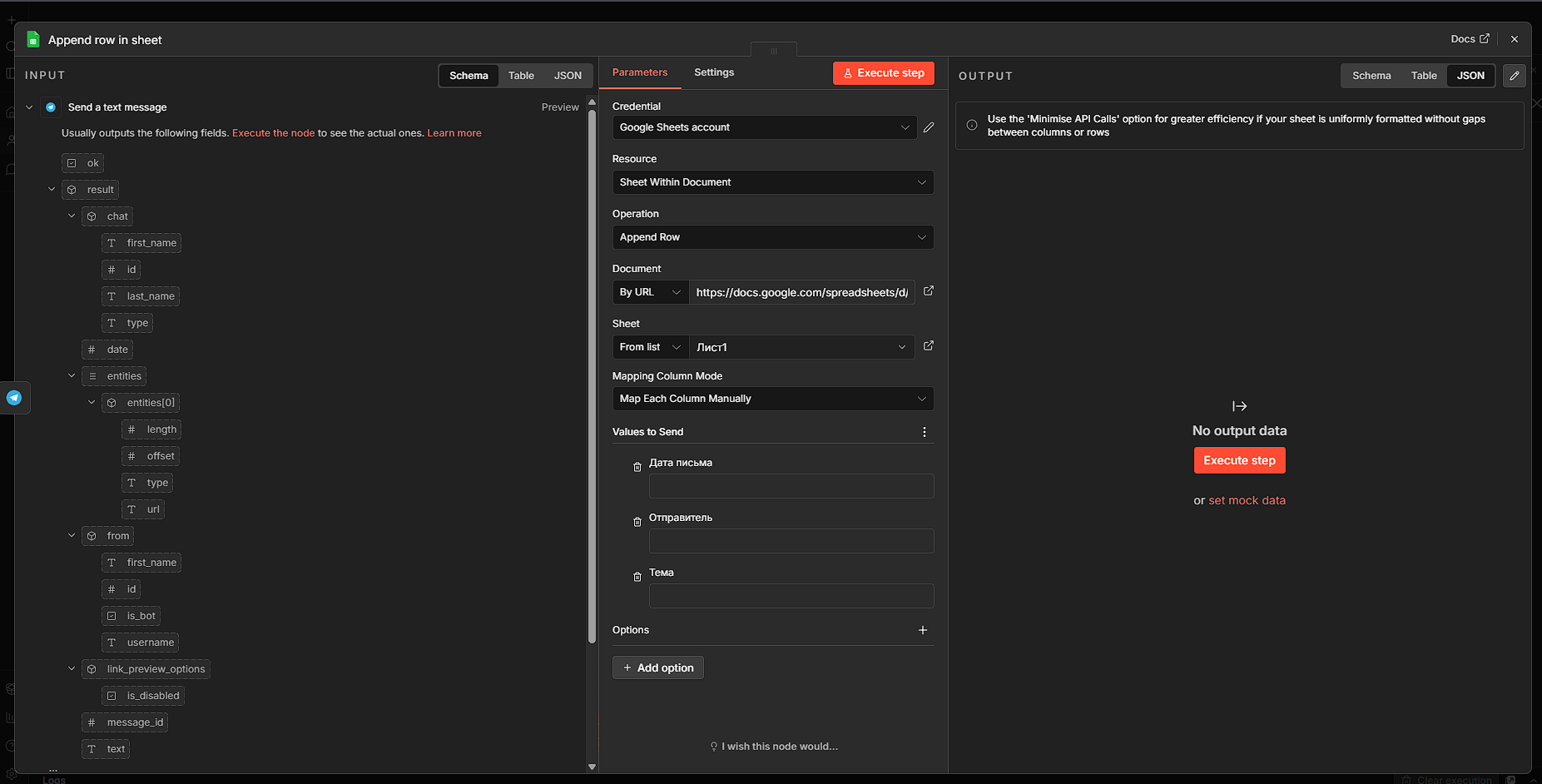 Совет: в Google Sheets заранее создайте заголовки колонок (Дата, Отправитель, Тема) — n8n прочитает их и предложит маппинг автоматически.