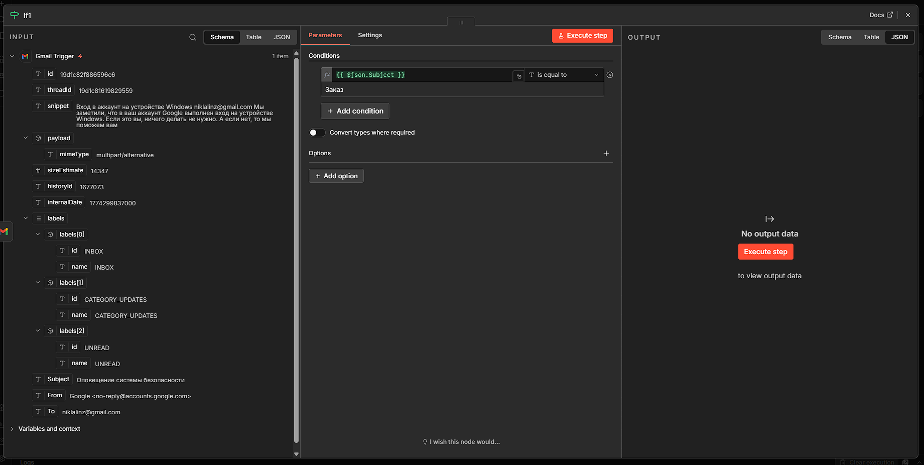 - Value 2 — впишите ключевое слово, например «заказ». Если тема содержит это слово, данные пойдут по ветке true. Все остальные письма уйдут в false — их мы просто игнорируем.