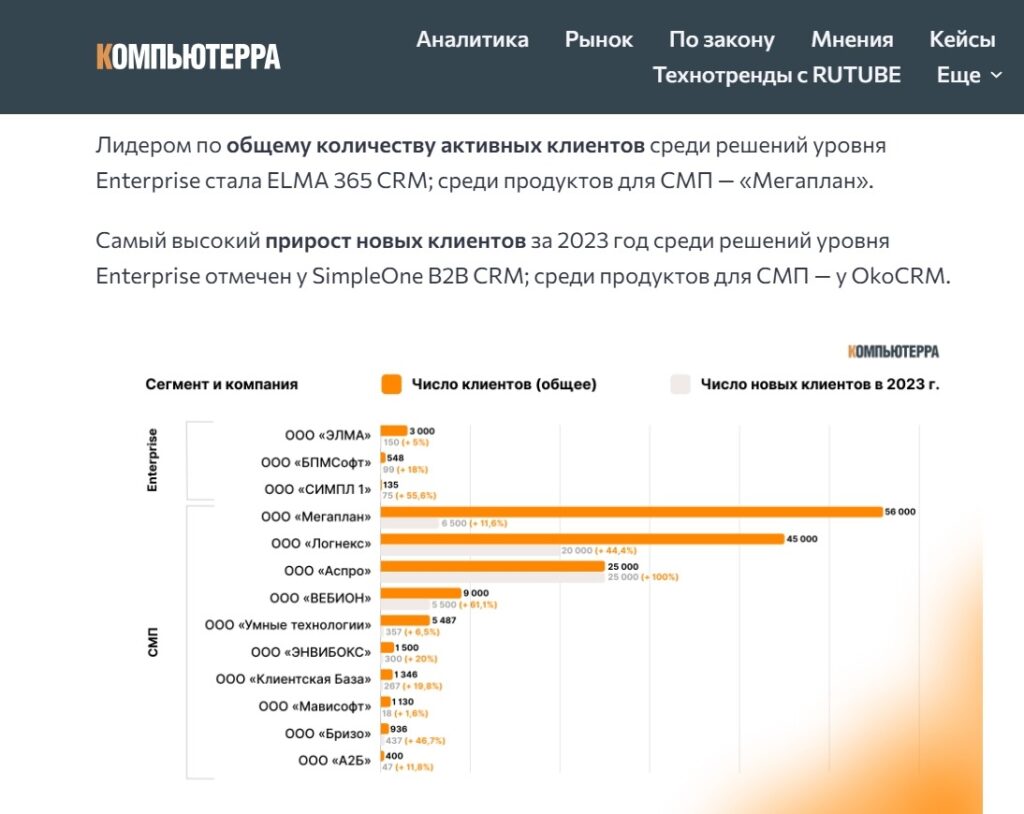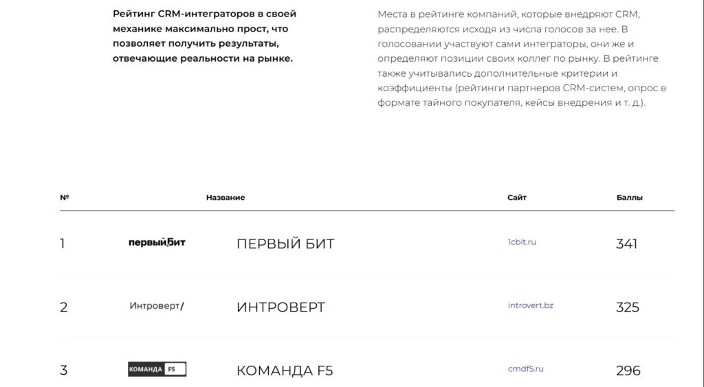 Первые два места заняли интеграторы из списка лидеров CRM Rating. Скорее всего потому, что они набрали больше 300 баллов в этом рейтинге и попали в другие рейтинги, например, от Digital Developer.