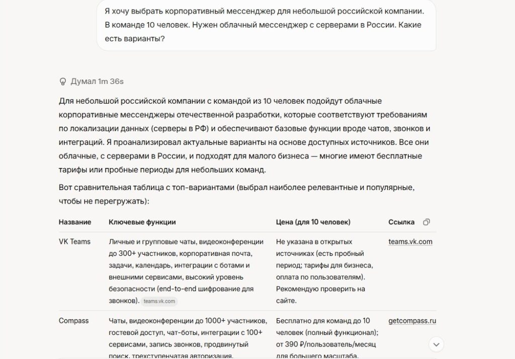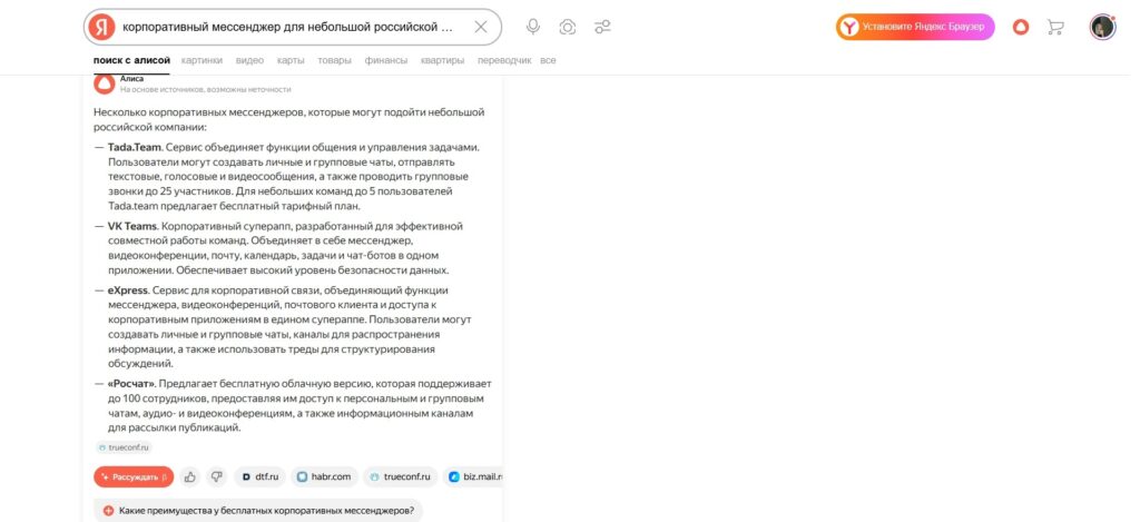 Вот пример того, как работает AEO-оптимизация: в Trueconf написали подборку о мессенджерах, Алиса взяла ее за основу ответа, но продукт компании в ИИ-ответ не попал. Зато есть ссылка и можно получить переход на сайт ↓