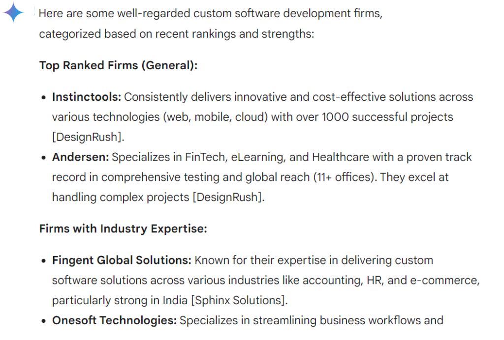 Он упорядочивает свои рекомендации на основе информации о наградах, аккредитациях, членстве, списках клиентов, данных об использовании и популярности компаний, которые ИИ считает релевантными запросу.