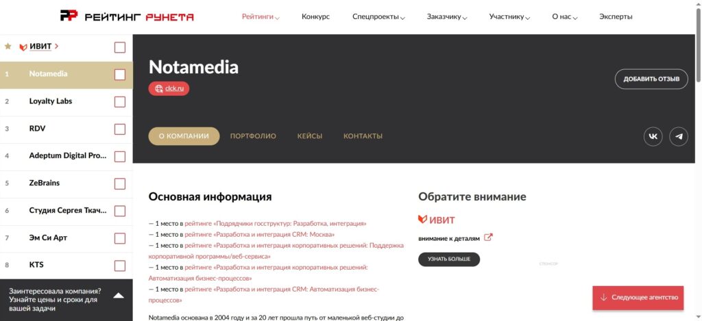 На третьем и четвертом местах интеграторы из «Рейтинга Рунета» Notamedia и Loyalty Labs. Обе компании занимают первые места сразу в нескольких рейтингах.